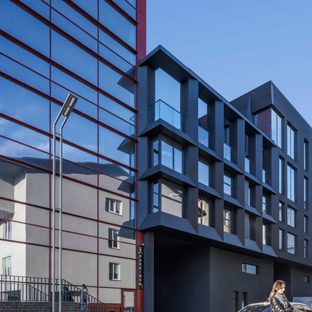 Проєкт розташований у колишній промисловій зоні Львова, яка переживає активну трансформацію. Торговельно-офісний центр з'єднаний з житловим комплексом і включає підземний паркінг та громадський простір. Об’єм змінної поверховості (2 і 4 поверхи) утворює низьку «паузу» між 15-поверховою житловою та 14-поверховою офісною секціями. На даху облаштовано зелену терасу. Фасади мають метричну сітку трикутних призм, що забезпечують захист від сонця, глибину, тінь та виразний графічний ритм.