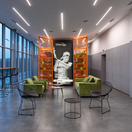 Адміністративно-побутовий комплекс тенісних кортів «Восход» на набережній Дніпра став прикладом делікатної міської реновації спортивної інфраструктури. Проєкт реалізовано в умовах складної видовженої ділянки, обмеженої висоти будівлі та необхідності зберегти плоский дах для інженерного обладнання. Архітектурним рішенням стала інверсійна аркова ферма, спрямована дугою вниз. Вона забезпечує надходження природного верхнього світла до роздягалень, водночас формуючи виразний графічний образ споруди. Усередині ферми інтегровано вентиляційні канали, що дозволило раціонально використати обмежений простір. Об’єм будівлі — лаконічний паралелепіпед, оздоблений панелями Equitone та структурним склінням, що підкреслює сучасний характер об’єкта. Інтер’єр підтримує архітектурну ідею екстер’єру: відкриті просторові зв’язки, природне світло та матеріальна цілісність формують комфортне середовище для спортсменів і відвідувачів. Комплекс став новою якісною точкою спортивної активності на набережній міста.