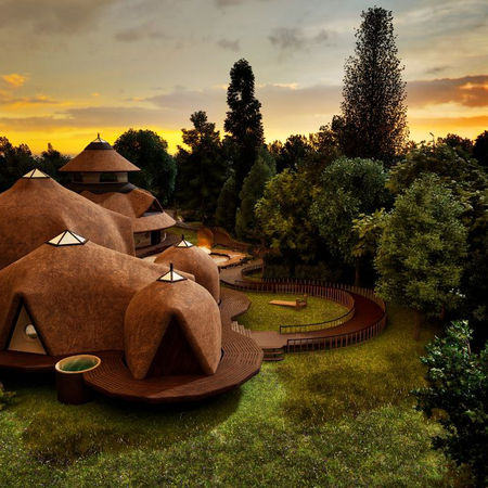 Усі зовнішні стіни виконані з костробетону товщиною 40 см — екологічного, теплоізоляційного матеріалу. Купол Покрівля — з очерету, розсіює магнітне поле та захищає від випромінювання.